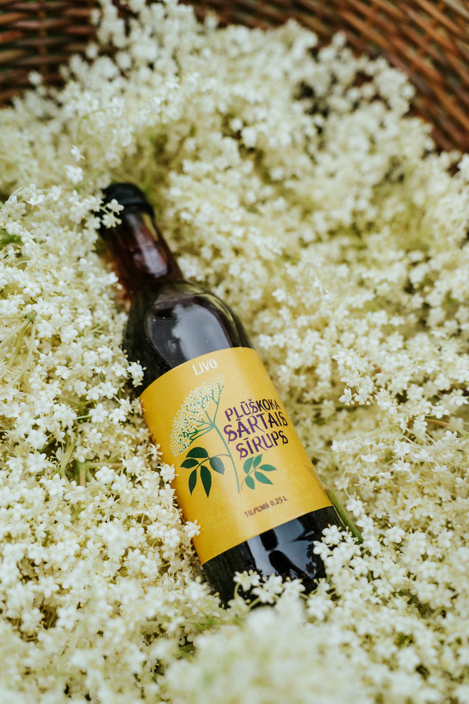 Sastāvdaļas: 65% Plūškoka ziedu sīrups (Cukurs 50%, ūdens, svaigi plūškoka ziedi, skābuma regulētājs - citronskābe), cidoniju sula, plūškoka ogu sula.